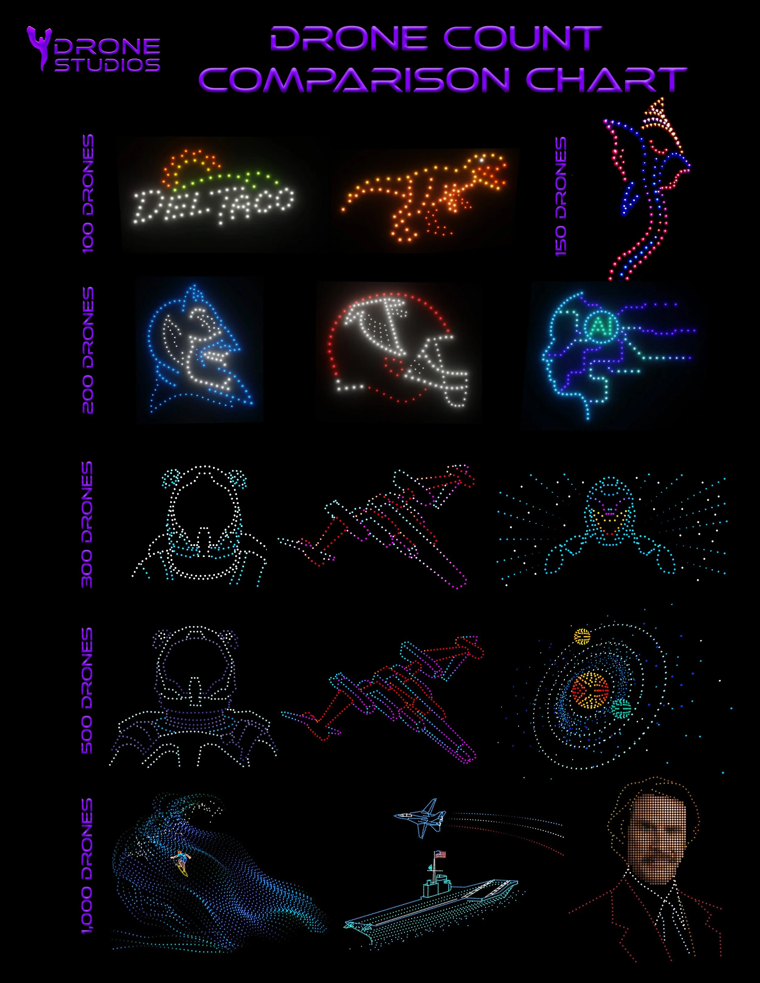 We have upgraded our fleet and offer shows up to 3,000 drones! Here are some of our new designs