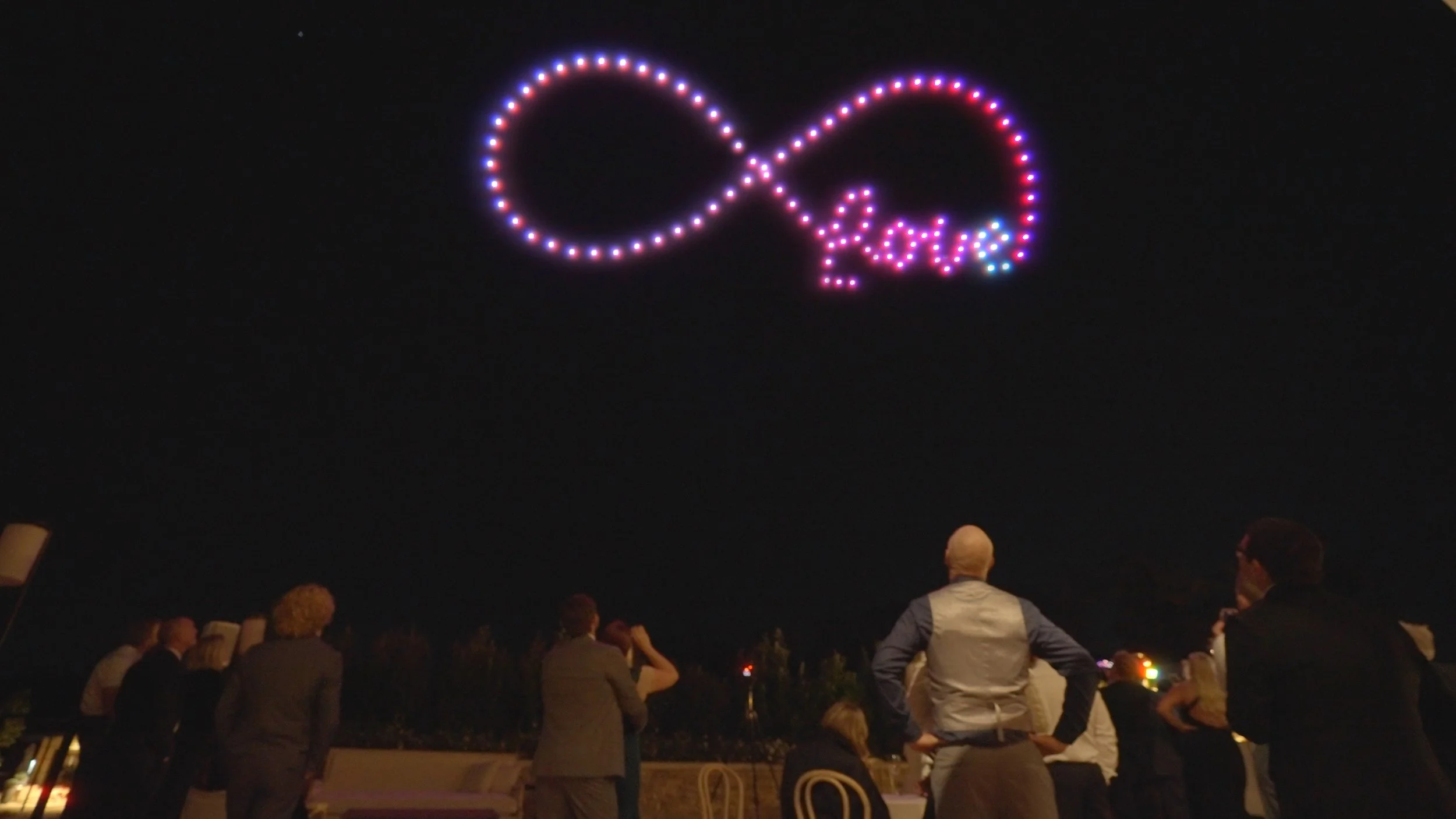 Drone show storytelling that begins with their wedding logo, introduction of both bride and groom, their love story, passions, common interests and a meaningful quote to close. This show included 200 drones.